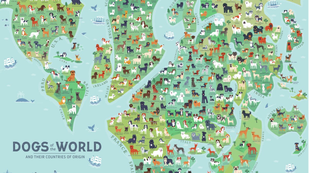 The map concentrates on the source locations of the dog breeds it portrays. And some regions of the world have been more prolific at breeding dogs than others. The World Canine Federation (FCI) recognizes around 350 dog breeds (some are in the ‘waiting room’), not all of which are represented on this map. But that roll call, ranked by country of origin, gives an indication why some of the lands shown are larger than others.