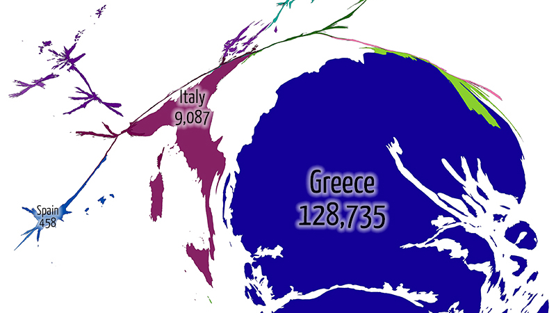 Is there a danger that Greece, impoverished by the eurozone crisis and strained by the refugee crisis, will collapse under its burden? Here are three maps that give an idea of the size of the problem. All three are cartograms, distorting the area of the countries on the map to reflect the number of refugees arriving by sea. The first one covers the period 2006 up to and including 2014.