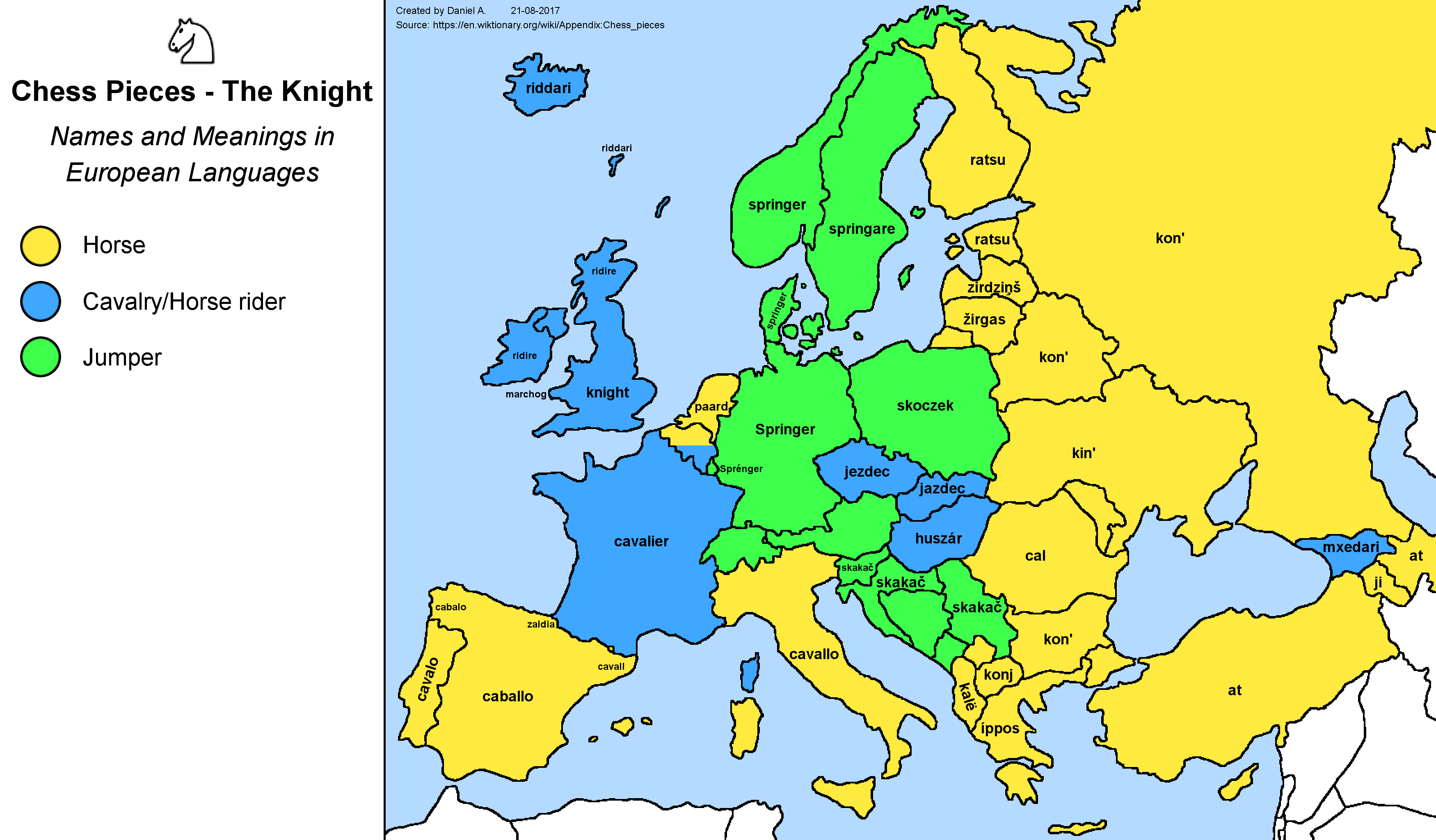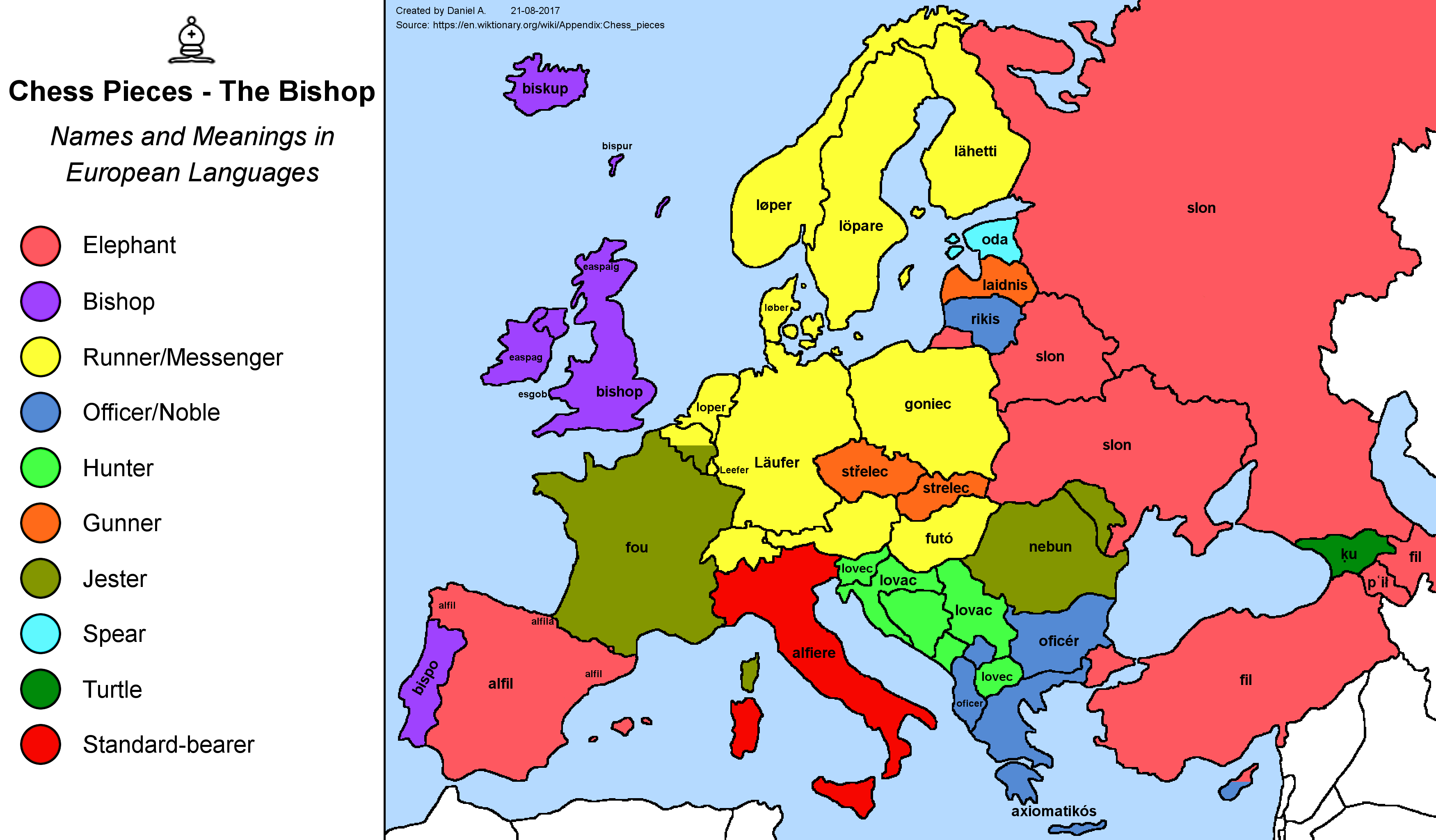 This piece’s kingly status is a constant throughout the map, from koról’ in Russian and König in German to erregea in Basque and teyrn in Welsh (although the latter word, related to “tyrant,” is a less common Welsh term for “king” than brenin). In Yiddish (not on the map), the king can be called kinig or meylekh, two words that mean the same, but derive from German and Hebrew, respectively. In Russian, alternate names include tsar (“emperor”) and kniaz (“prince”).