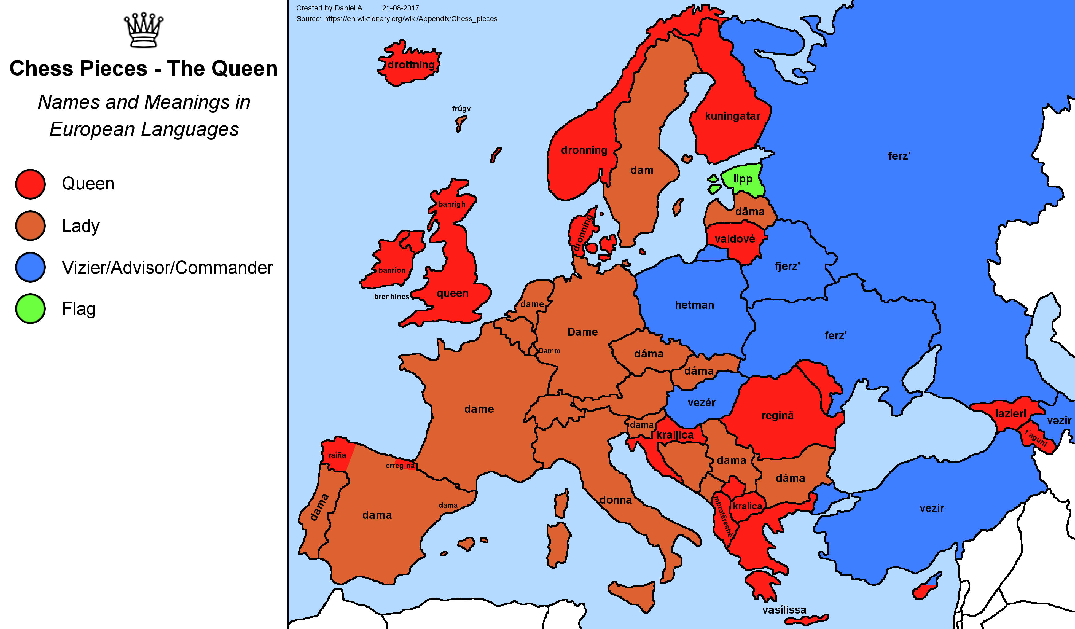 While the piece is called “lady” or “queen” in most European languages, Russian and other Slavic languages retain versions of ferz, the Persian term for “counselor.” Polish uses hetman, a high military rank from Eastern European history. Russian (and other Slavic languages) also variously use(d) koroleva (“queen”), korolevna (“princess”), tsaritsa (“emperor’s wife”), kral (“queen”), dama (“lady”), and baba (“old woman”).