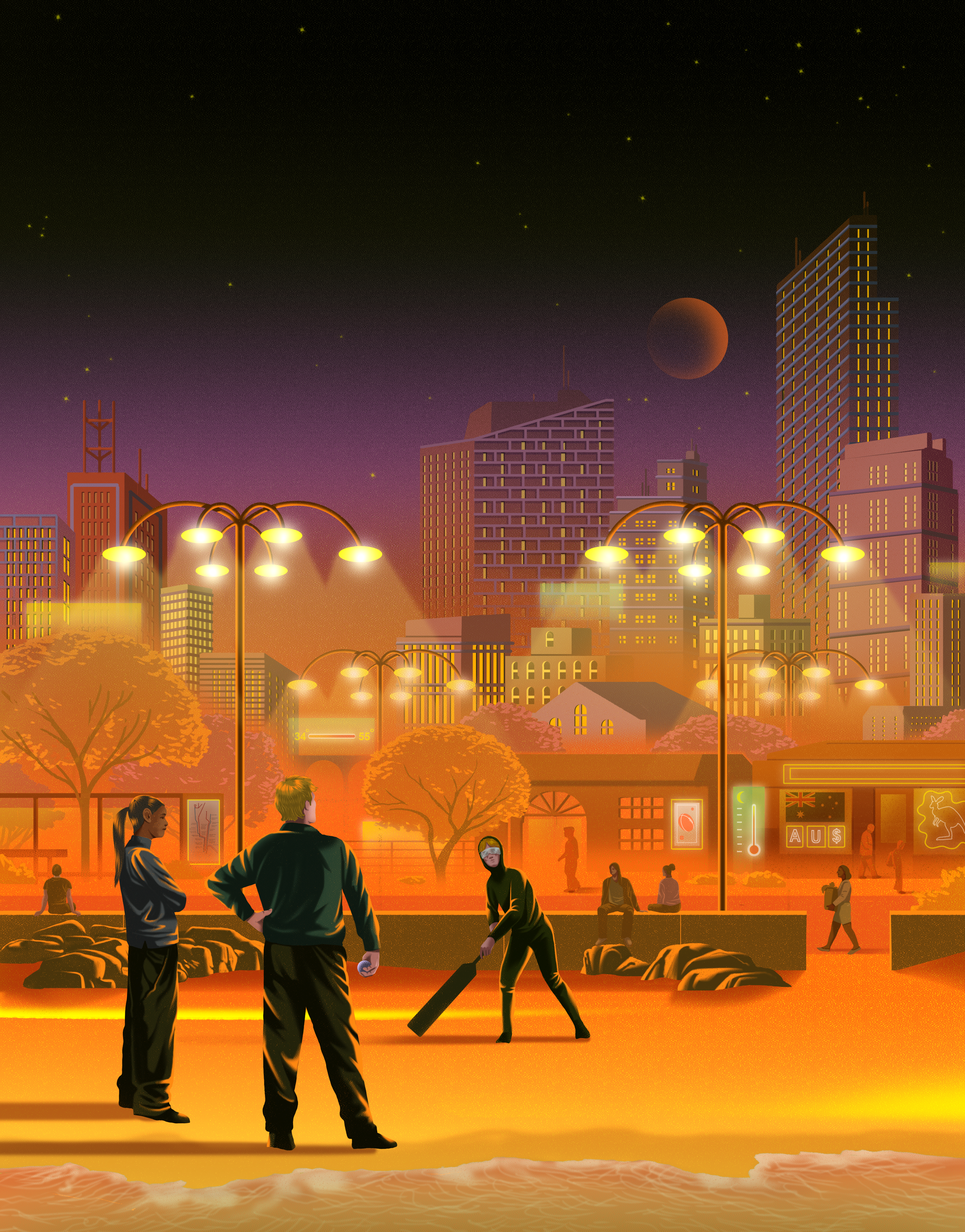 Australia has abandoned the daytime and gone nocturnal. Schools and workplaces open at night, construction sites buzz in the small hours under massive floodlights, and outdoor recreation takes place in the twilights of dawn and dusk. The middle of the day is for mandatory Sun siestas. Going out at noon is dangerous — probably requiring immediate hospitalization. Fashion goes wide-brimmed and long-sleeved. Exposing your skin becomes a lifestyle choice in the same risk-seeking category as free solo rock climbing.