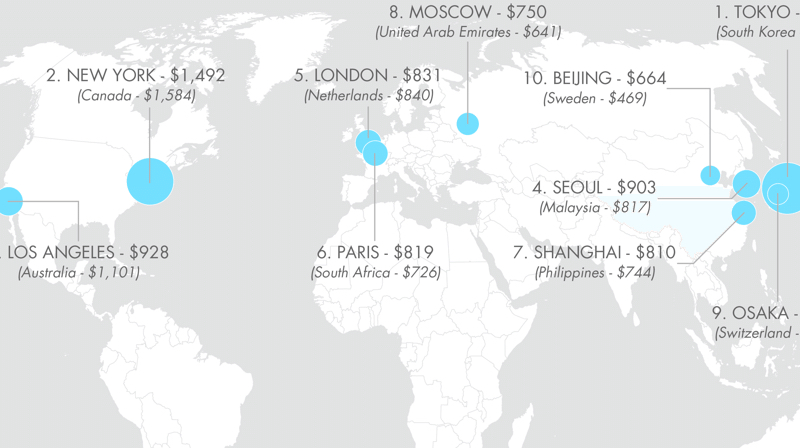 This map compares the 2015 Gross Domestic Product in Purchasing Power Parity, expressed in billions of dollars, of the world’s ten richest metro areas to that of countries with a similar GDP-PPP$.