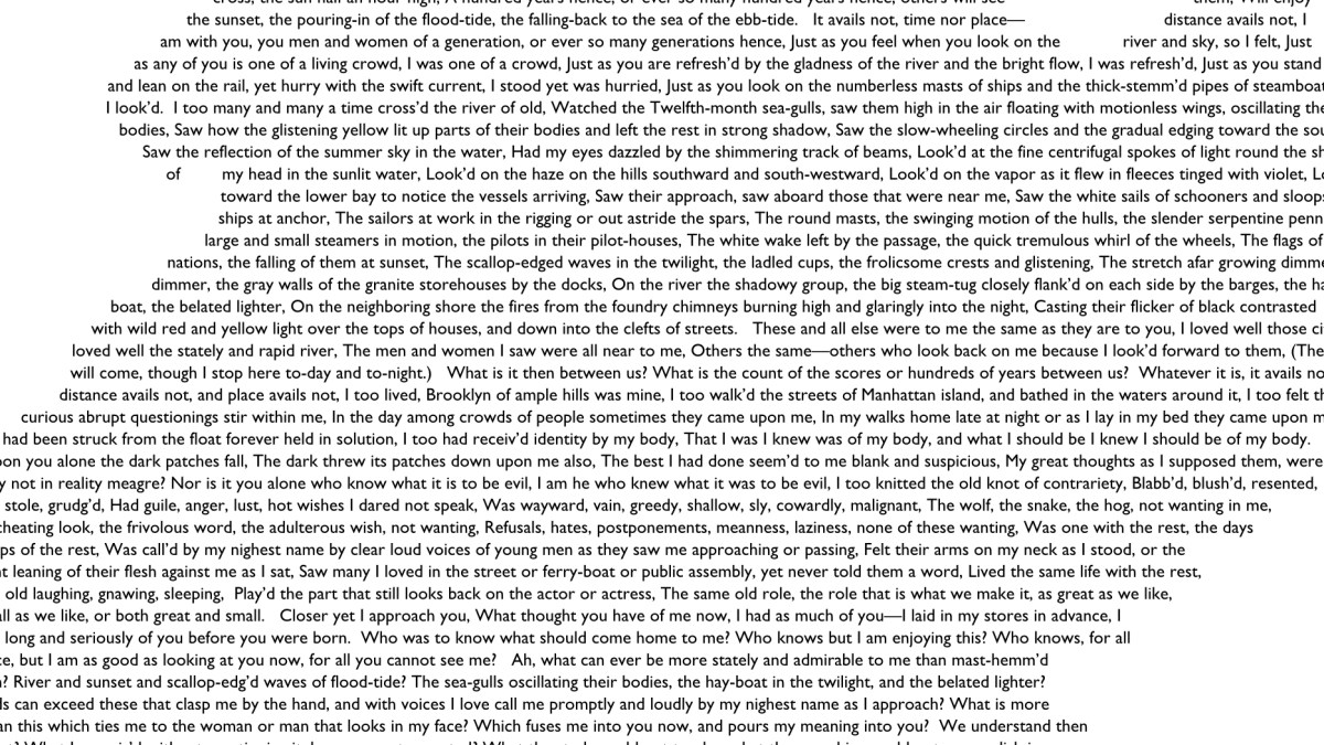So begins Crossing Brooklyn Ferry, a stirring, enumerative ramble of a poem by Walt Whitman, first published in 1856 under the title Sun Down Poem and later included in Leaves of Grass, his constantly-expanding magnum opus.