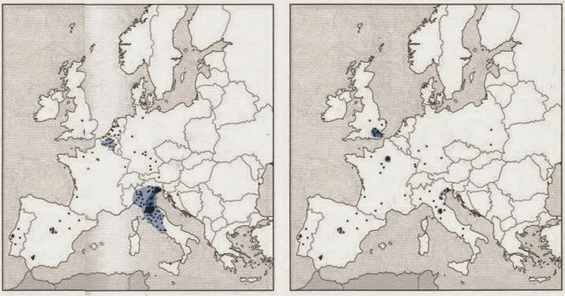 In the 15th and 16th century, three distinct areas emerged as the centres of creative genius. The art world was dominated by northern Italy (in blue) and especially by its cities (black dots), with secondary centres in the Low Countries and around Madrid. The world of literature was more polycentric, concentrated around major cities like Paris, again Madrid, and some of the northern Italian cities, but the major concentration is around London.