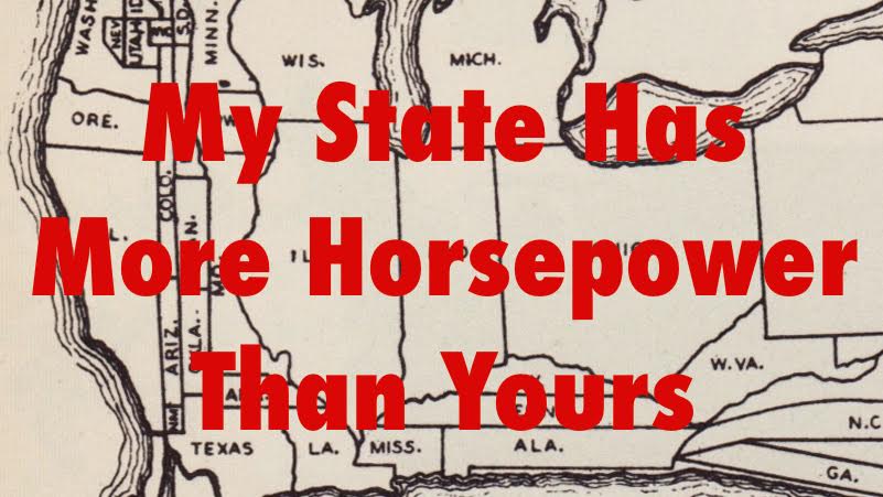 This Horsepower Map of the United States distorts the area of each state to reflect the amount of horsepower installed. Not actual horses, mind you — the year is 1933, not 1833 — but horsepower as a unit of measure for mechanical power (i.e., 1 hp = 746 watt) and ultimately industrial output.