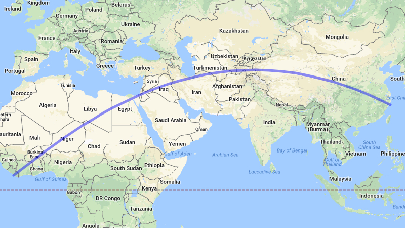 Start in Shitangzhen, a Chinese coastal city just south of Shanghai. March inland, and keep walking over the mountains and across the deserts of China’s Far East. Cross Central Asia into Iran, and narrowly avoid the Caspian Sea. Pass through Iraq, Jordan and Israel (watch out you don’t fall into the Mediterranean). Walk across the Sinai Desert, through the Nile Valley, and then onwards to the Sahara and Sahel. Finally arrive about 6 miles (10 km) north of Greenville, on Liberia’s Atlantic coast (1).