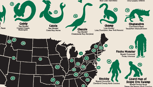 The natural world is losing up to 2,000 species a year, and that’s a low estimate. Fortunately, one corner of the animal kingdom is immune from extinction: the monsters that thrive in our imagination. This map unites America’s most famous cryptids on one map, from Caddy, a Northwestern sea serpent, over Nebraska’s Alkali Lake monster to the skunk apes of Southern Florida.