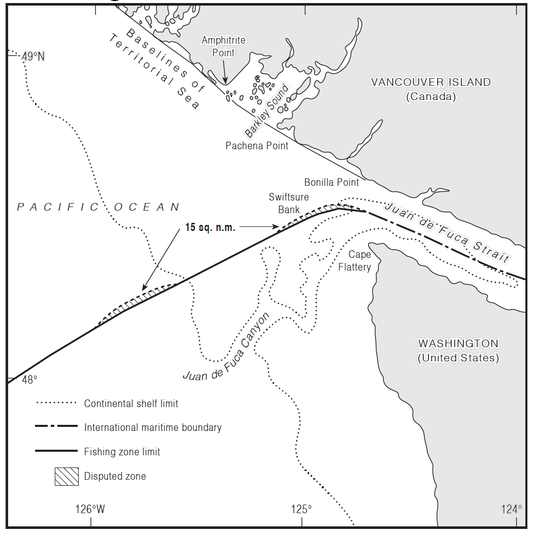To complicate matters, the provincial government of British Columbia has rejected both the Canadian and American borderlines and the entire principle of equidistance. It argues for the principle of natural prolongation, claiming that the appropriate boundary is the submarine canyon (also named Juan de Fuca). Although that would mean a better border for British Columbia, the Canadian government is loath to give up the principle of equidistance, which could cost it dearly in other areas.