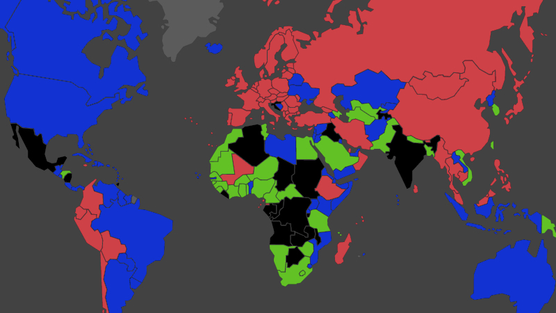 Elsewhere on the Passport Index website, a world map provides an overview. Eliminating the hues to focus on the four main colours, the map looks like a game of Risk in full progress: some clustering ongoing, but still plenty of random variation.