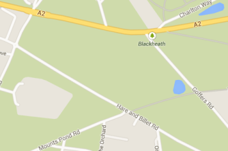 What she found was Whitfield Road. In her A-Z (and my edition too), it’s the continuation of General Wolfe Road on the south side of Shooters Hill Road, connecting it to Hare and Billet Road. But on other maps, and in real life, there’s just the unbroken green of Blackheath Common.