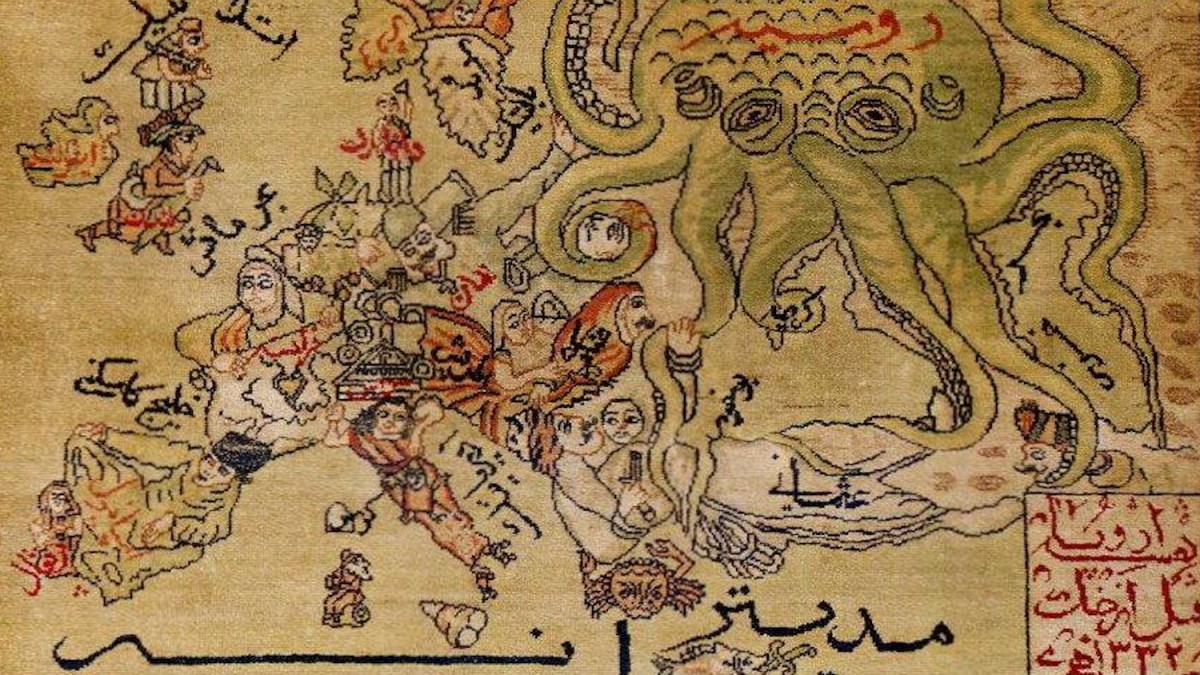 These maps showed animate versions of European nations, variously trampling, shoving and strangling each other. This rug is an almost identical copy of the Fred W. Rose map. Its main feature is Russia as an octopus, stretching out its tentacles towards Central Europe, the Balkans and the Middle East.