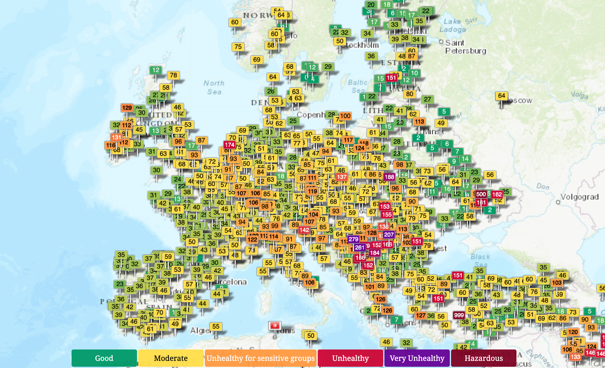 Those measurements are translated into a figure on a scale from 0 to 500. That figure goes into one of six color-coded categories — the higher, the worse: