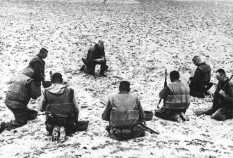 22nd March 1966: US marines carrying rifles and wearing anti-fragmentation jackets kneel in prayer before moving on to battle stations at Da Nang in South Vietnam. (Photo by Keystone/Getty Images)
