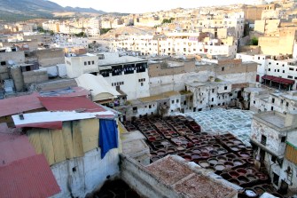 In 2008 I peered outside the window of a fabric shop perched high atop a building in Fez’s medina, one of the world’s largest car-free zones. Before the sight came the stench, dozens of industrial vats filled with dyes, lithe Moroccans scurrying between giant buckets tending to the leather the colors are destined for.