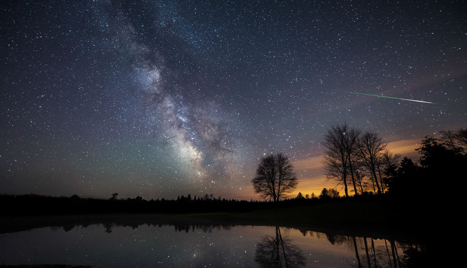 The early morning hours of May 6 were moonless when grains of cosmic dust streaked through dark skies. Swept up as planet Earth plows through dusty debris streams left behind periodic Comet Halley, the annual meteor shower is known as the Eta Aquarids. This inspired exposure captures a meteor streak moving left right through the frame. Its trail points back across the arc of the Milky Way to the shower’s radiant above the local horizon in the constellation Aquarius. Known for speed Eta Aquarid meteors move fast, entering the atmosphere at about 66 kilometers per second. Still waters of the small pond near Albion, Maine, USA reflect the starry scene and the orange glow of nearby artificial lights scattered by a low cloud bank. Of course, northern hemisphere skygazers are expecting a new meteor shower on May 24, the Camelopardalids, caused by dust from periodic comet 209P/LINEAR.