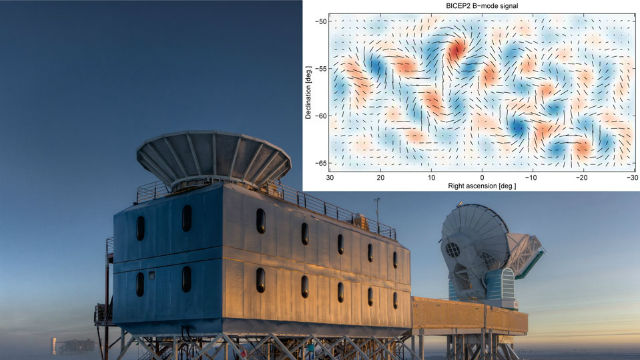 Such an inflationary epoch has been postulated to explain several puzzling cosmic attributes such as why our universe looks similar in opposite directions. Yesterday, results were released showing an expected signal of unexpected strength, bolstering a prediction of inflation that specific patterns of polarization should exist in cosmic microwave background radiation — light emitted 13.8 billion years ago as the universe first became transparent. Called B-mode polarizations, these early swirling patterns can be directly attributed to squeeze and stretch effects that gravitational radiation has on photon-emitting electrons. The surprising results were discovered in data from the Background Imaging of Cosmic Extragalactic Polarization 2 (BICEP2) microwave observatory near the South Pole. BICEP2 is the building-mounted dish pictured above on the left. Note how the black polarization vectors appear to swirl around the colored temperature peaks on the inset microwave sky map. Although statistically compelling, the conclusions will likely remain controversial while confirmation attempts are made with independent observations.