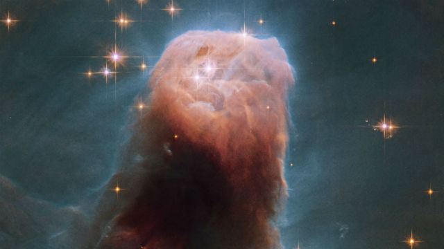 Cones, pillars, and majestic flowing shapes abound in stellar nurseries where natal clouds of gas and dust are buffeted by energetic winds from newborn stars. The Cone Nebula, a well-known example, lies within the bright galactic star-forming region NGC 2264. The Cone was captured in unprecedented detail in this close-up composite of several observations from the Earth-orbiting Hubble Space Telescope. While the Cone Nebula, about 2,500 light-years away in Monoceros, is around 7 light-years long, the region pictured here surrounding the cone’s blunted head is a mere 2.5 light-years across. In our neck of the galaxy that distance is just over half way from the Sun to its nearest stellar neighbor, the Alpha Centauri star system. The massive star NGC 2264 IRS, seen by Hubble’s infrared camera in 1997, is the likely source of the wind sculpting the Cone Nebula and lies off the top of the image. The Cone Nebula‘s reddish veil is produced by glowing hydrogen gas.