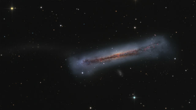 Sharp telescopic views of NGC 3628 show a puffy galactic disk divided by dark dust lanes. Of course, this deep portrait of the magnificent, edge-on spiral galaxy puts some astronomers in mind of its popular moniker, the Hamburger Galaxy. It also reveals a small galaxy nearby, likely a satellite of NGC 3628, and a faint but extensive tidal tail. The tantalizing island universe itself is about 100,000 light-years across and 35 million light-years away in the northern springtime constellation Leo. Its drawn out tail stretches for about 300,000 light-years, even beyond the left edge of the wide frame. NGC 3628 shares its neighborhood in the local Universe with two other large spirals M65 and M66 in a grouping otherwise known as the Leo Triplet. Gravitational interactions with its cosmic neighbors are likely responsible for creating the tidal tail, as well as the extended flare and warp of this spiral’s disk.