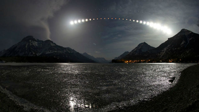 Recorded on April 15th, this total lunar eclipse sequence looks south down icy Waterton Lake from the Waterton Lakes National Park in Alberta, Canada, planet Earth. The most distant horizon includes peaks in Glacier National Park, USA. An exposure every 10 minutes captured the Moon’s position and eclipse phase, as it arced, left to right, above the rugged skyline and Waterton town lights. In fact, the sequence effectively measures the roughly 80 minute duration of the total phase of the eclipse. Around 270 BC, the Greek astronomer Aristarchus also measured the duration of lunar eclipses – though probably without the benefit of digital clocks and cameras. Still, using geometry, he devised a simple and impressively accurate way to calculate the Moon’s distance, in terms of the radius of planet Earth, from the eclipse duration. This modern eclipse sequence also tracks the successive positions of Mars, above and right of the Moon, bright star Spica next to the reddened lunar disk, and Saturn to the left and below.
