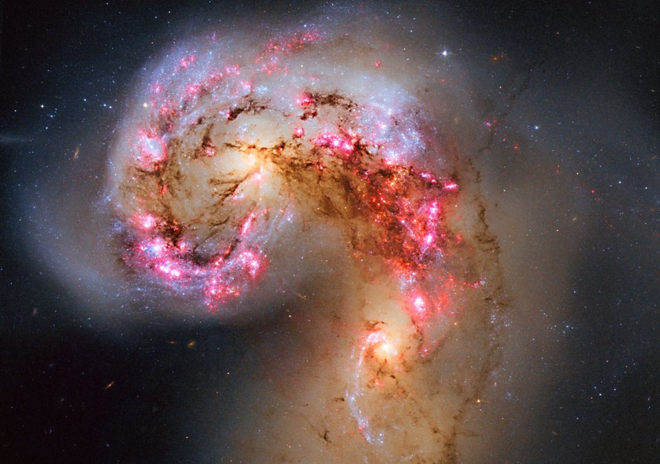 Two galaxies are squaring off in Corvus and here are the latest pictures. When two galaxies collide, the stars that compose them usually do not. That’s because galaxies are mostly empty space and, however bright, stars only take up only a small amount of that space. During the slow, hundred million year collision, one galaxy can still rip the other apart gravitationally, and dust and gas common to both galaxies does collide. In this clash of the titans, dark dust pillars mark massive molecular clouds are being compressed during the galactic encounter, causing the rapid birth of millions of stars, some of which are gravitationally bound together in massive star clusters.