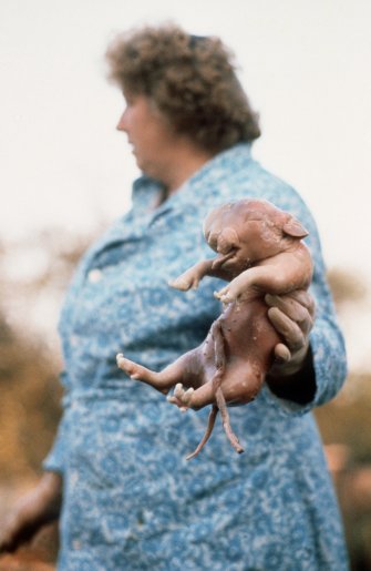 A woman holds a disabled newly-born pig — a victim of the radioactivity fall-out of the Chernobyl nuclear accident in 1986. Photo was taken on October 2nd, 1989(Photo credit: LARS GRANSTRAND/AFP/Getty Images)