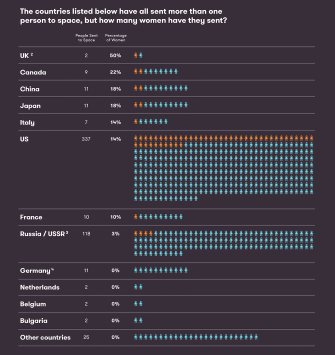 On the other side of the table, although numbers are still small, countries like Canada, China, and Japan have the highest percentage of female space explorers, sending six women to space between them.