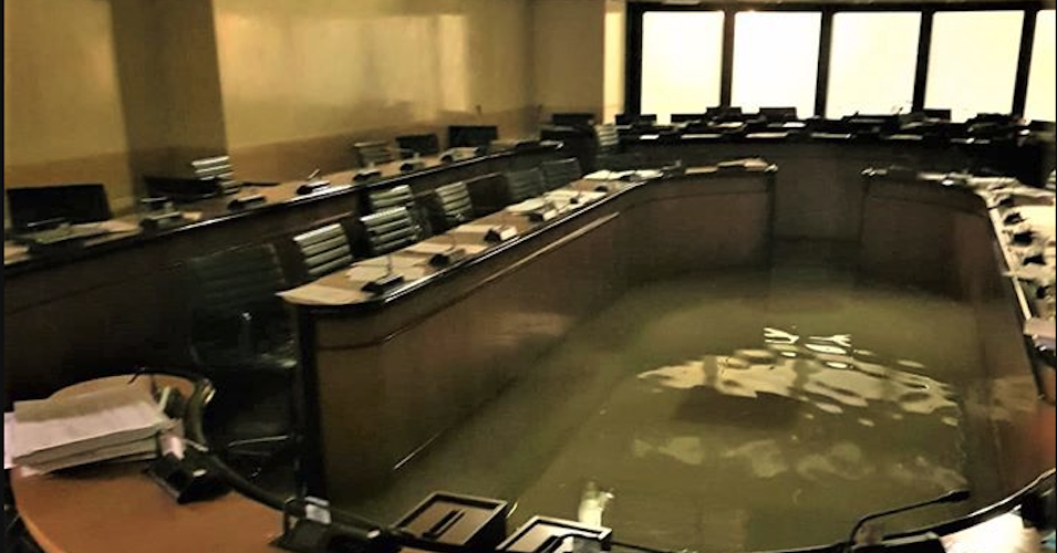 In a metaphor too apt to be made up, the council has been forced to relocate until the flood waters recede.
