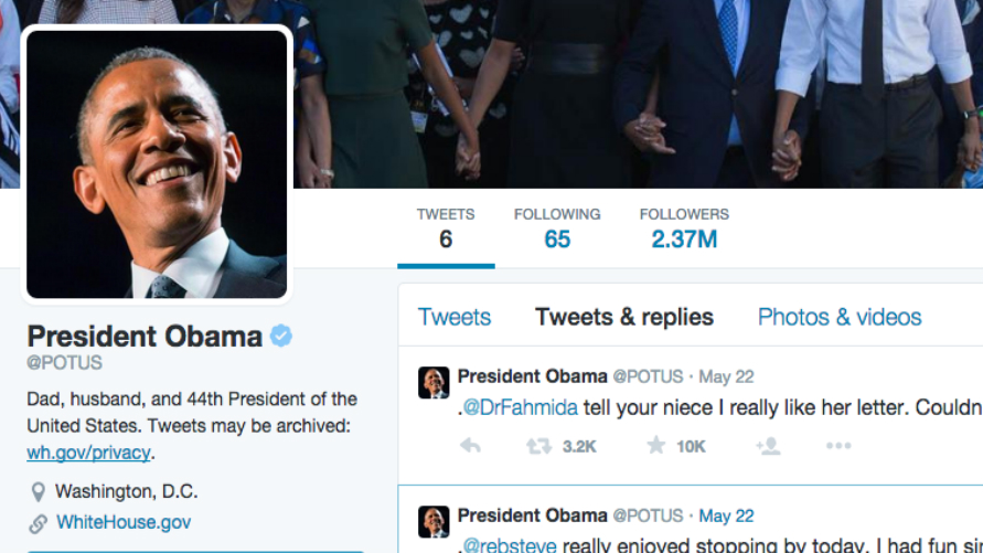 2. Obama doesn't do much engaging. I understand the guy's busy and all, but six total tweets (including three replies) isn't exactly a bounty. The content of those tweets has been predictably vanilla: Commencement with the Coast Guard, a staged visit to a Jewish Pre-K class, and a brief answer to a 5-year-old's letter.