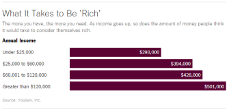 So here is what is depressing. The average American believes that “rich” is an adjective applying to somewhere between the top 5 percent and the top fraction of 1 percent of earners. That’s not a lot of people. And as they walk farther down the income corridor, seeing their take-home pay rise, the target, the objective, recedes into the distance. For all but the filthy rich, the goal of becoming rich looks pretty unattainable.