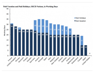 This is bad, and not just for the individuals who lack time off or fail to take it. Workers who don’t get time off are sicker, less productive and less imaginative than employees with paid vacation days. Despite all those weeks sunning themselves and enjoying breaks from work, the French are among the most productive workers in the world. Likewise for the Germans, who receive not only a minimum of 20 days of vacation, but also 10 paid holidays a year. According to a recent study, Americans’ penchant for working themselves to the bone carries negative economic effects: