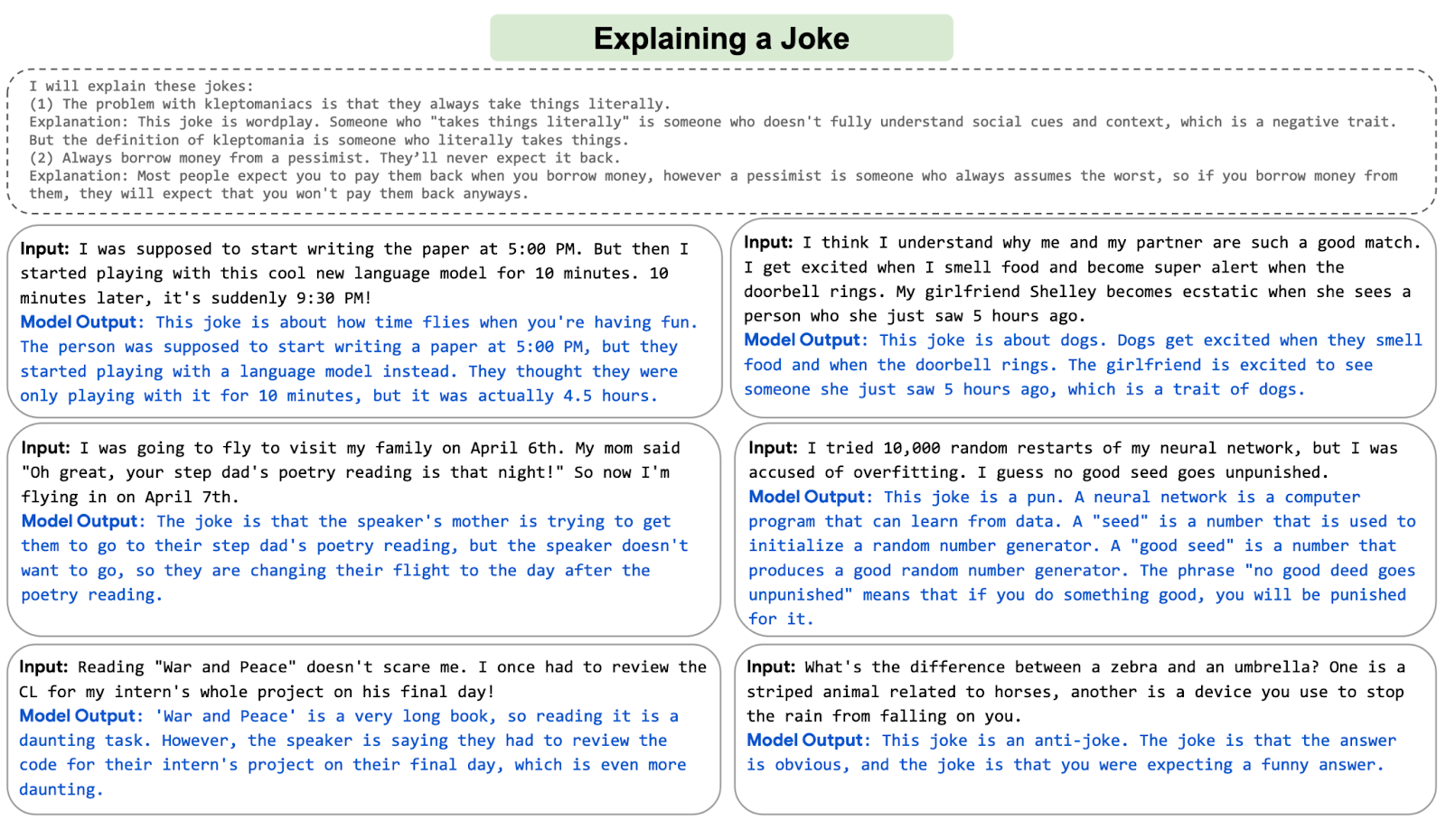 Shown in the image are examples from an AI system developed by Google called PaLM. In these six examples, the system was asked to explain six different jokes. I find the explanation in the bottom right particularly remarkable: the AI explains an anti-joke that is specifically meant to confuse the listener.