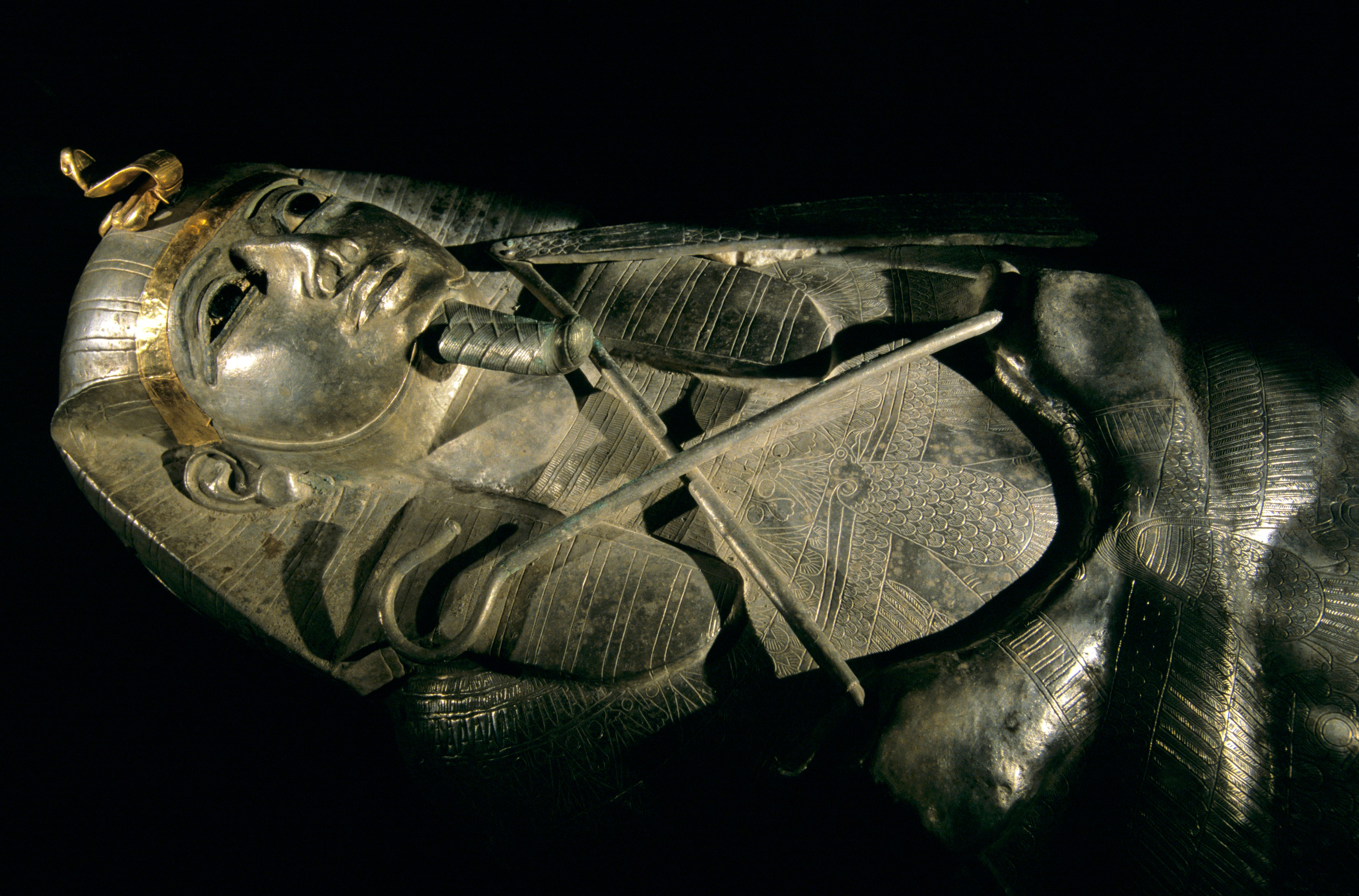 In early 1939, French archaeologist Pierre Montet made one of the greatest discoveries in Egyptology: a royal burial complex that included the intact tombs of three ancient kings. Montet was working at the site of Tanis, the home base of kings in the 21st and 22nd dynasties (about 1075 to 715 B.C). By then, the country’s power had diminished greatly, and the country was divided, with kings controlling the north and religious officials holding court in the south in Waset (modern Luxor). Judging from what Montet found, though, the royals were still fabulously wealthy. In the tomb of King Psusennes I, for example, this gold-trimmed coffin of silver held the king’s remains. A mask of gold covered his head and shoulders, and gold sandals enveloped his feet. In death a king became a deity, so it was fitting for his mummy to wear gold, believed to be the skin of the gods. Sadly, Montet’s discovery never got the recognition it deserved. World War II soon dominated the news, and people had little interest in archaeology, no matter how big a treasure it might have unearthed.