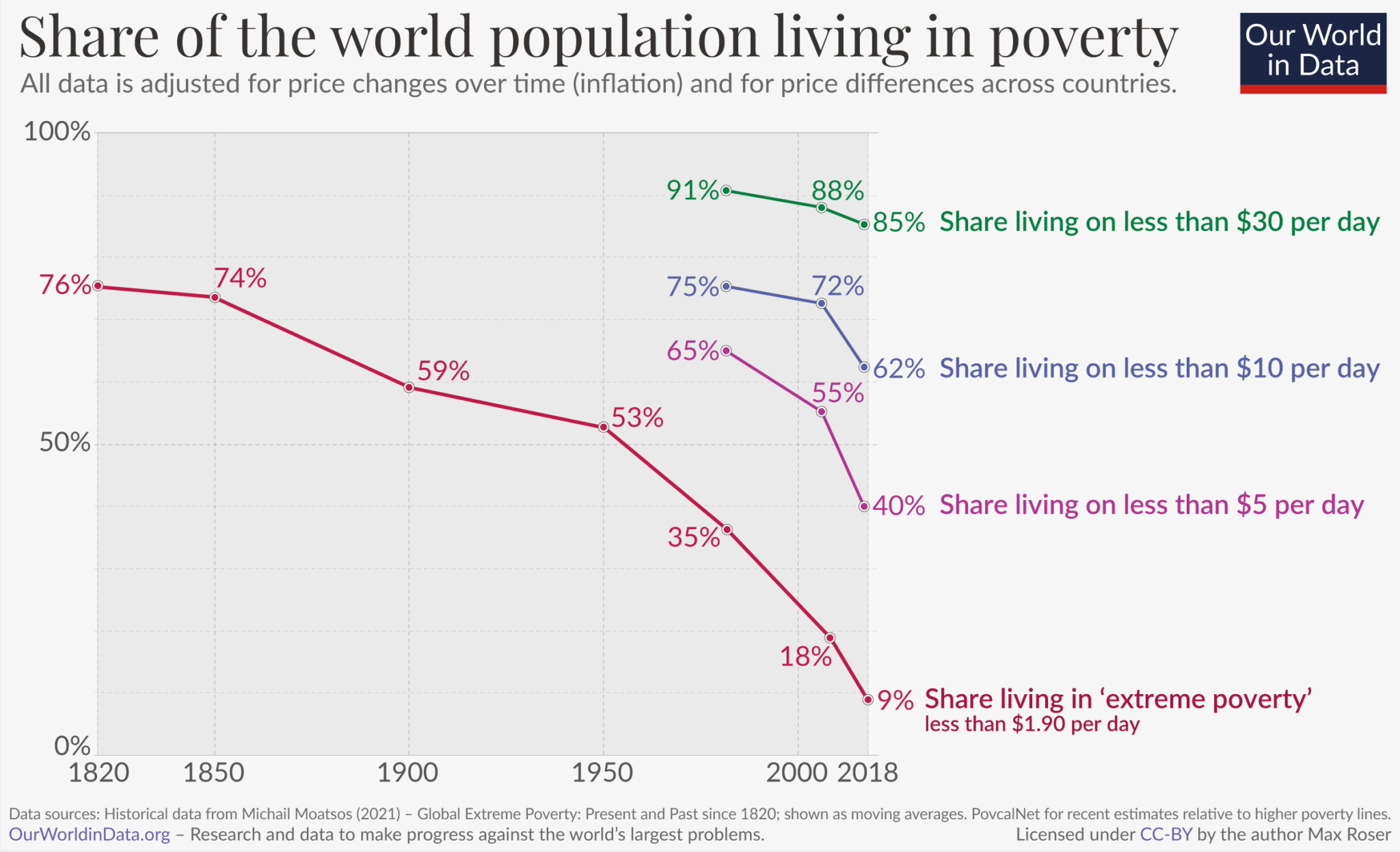 The final chart summarizes the global history of poverty. It focuses on the last two centuries when humanity left the stagnation of the past behind and achieved growth for the first time.