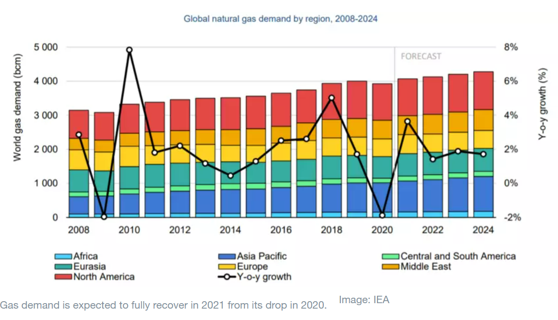 In its Global Gas Security Review, the International Energy Agency (IEA) says gas demand is likely to rebound by 3.6% across 2021. If left unchecked, by 2024 global gas consumption could have grown 7% higher than pre-pandemic levels.