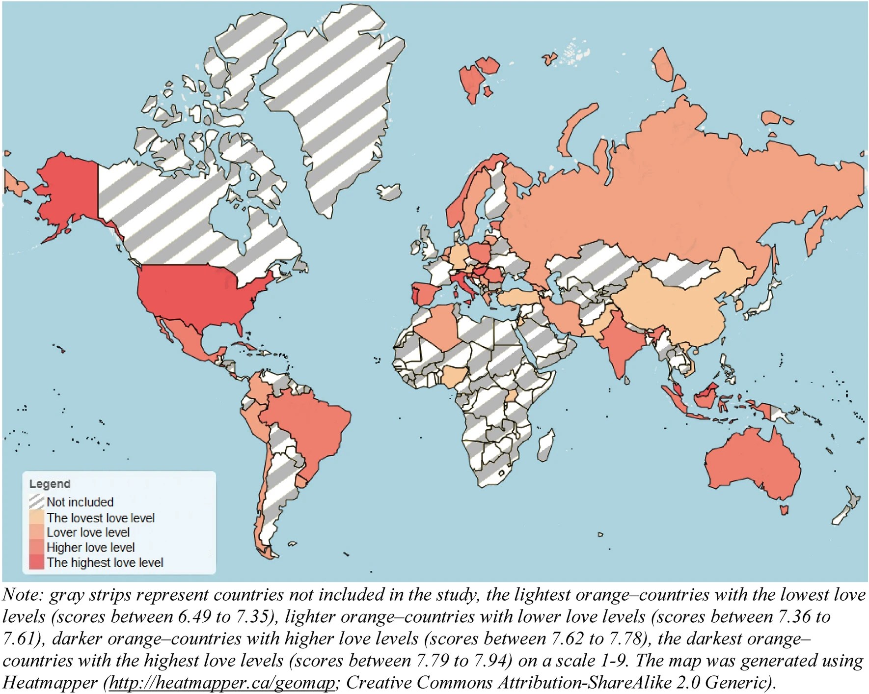 It was also unsurprising that warmer countries also tended to have greater love levels. Higher temperatures encourage people to socialize more, wear more revealing clothing, and be more emotionally expressive.