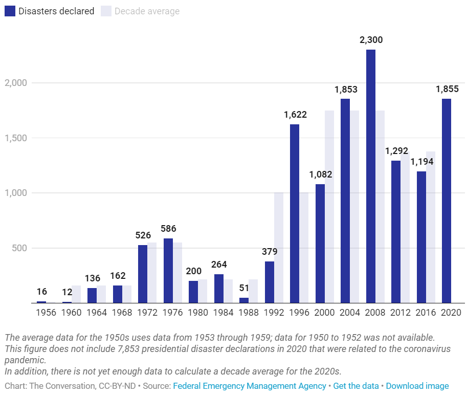 During Donald Trump’s reelection bid in 2020, there were 7,854 COVID-19 disaster declarations, on top of 1,855 other disasters that year, which already vastly exceeded the prior decade’s average of 1,375.3 FEMA disaster declarations.