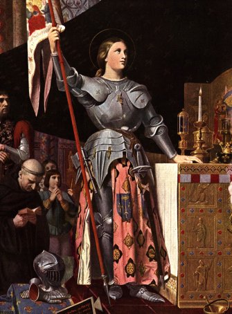 Saint Joan of Arc (1412 – 1431), known as ‘the Maid of Orleans’, at Reims Cathedral for the coronation of the dauphin as King Charles VII, circa 1429, accompanied by her squire Anton, her chaplain Jean Pasquerel and her pages. Painting by J D Ingres in the Louvre. (Photo by Hulton Archive/Getty Images)