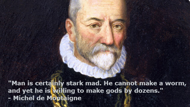 “Man is certainly stark mad. He cannot make a worm, and yet he is willing to make gods by dozens.” — Michel de Montaigne