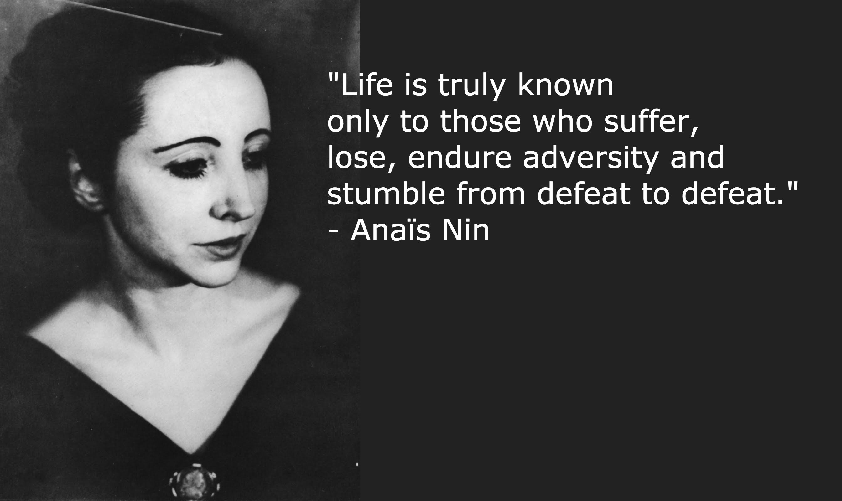 “Life is truly known only to those who suffer, lose, endure adversity and stumble from defeat to defeat.” – Anaïs Nin (born on this date in 1903)