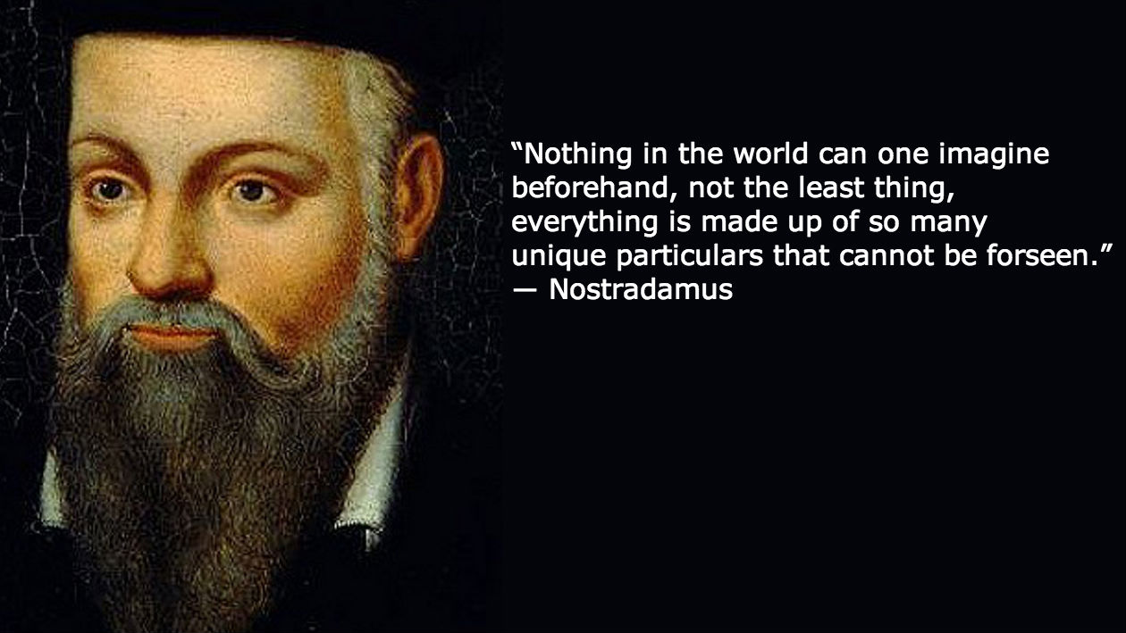 “Nothing in the world can one imagine beforehand, not the least thing, everything is made up of so many unique particulars that cannot be foreseen.” ― Nostradamus (born on this date in 1503, we think)