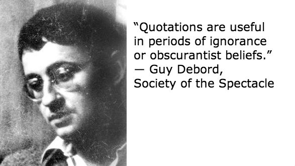 “Quotations are useful in periods of ignorance or obscurantist beliefs.” ― Guy Debord (born on this date in 1931)