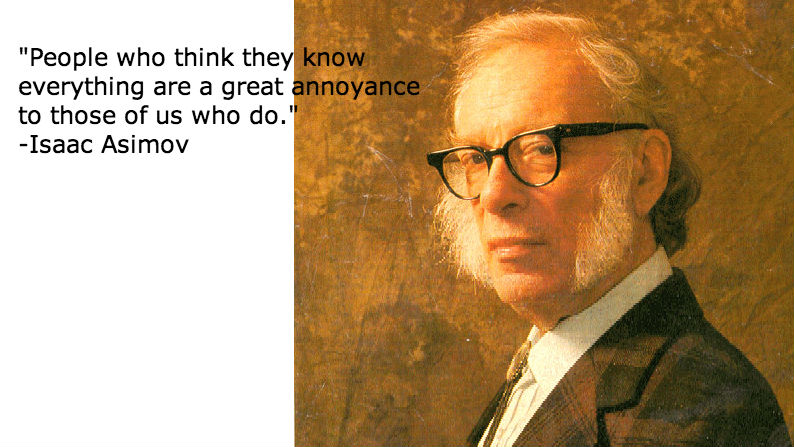 “People who think they know everything are a great annoyance to those of us who do.”-Isaac Asimov (born on this date in 1920)