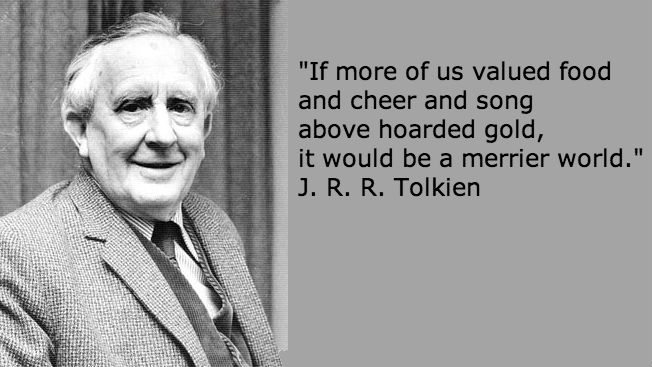 “If more of us valued food and cheer and song above hoarded gold, it would be a merrier world.”-J. R. R. Tolkien (born on this date in 1892)