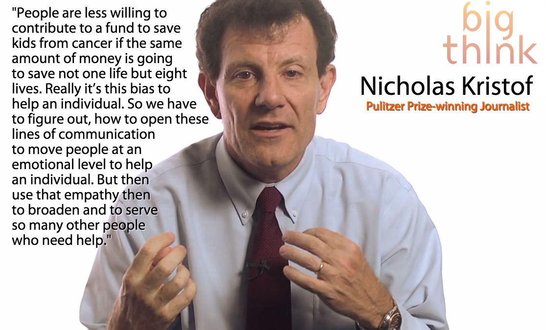 “People are less willing to contribute to a fund to save kids from cancer if the same amount of money is going to save not one life but eight lives. Really it’s this bias to help an individual. So we have to figure out, how to open these lines of communication to move people at an emotional level to help an individual. But then use that empathy then to broaden and to serve so many other people who need help.”